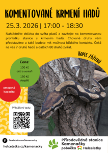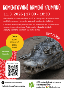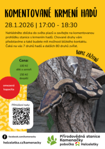 Srdečně zveme na Návštěvní den na Přírodovědné stanici Kamenačky. Přijďte se podívat na naše hmyzáky, slizáky, plazáky a chlupáče. Poprvé uvidíte i některé zcela nové zvířecí obyvatele ! Branka stanice se pro všechny přírodovědné nadšence otevře v sobotu 28. února 2026 v době od 9:00 do 16:00 hodin.